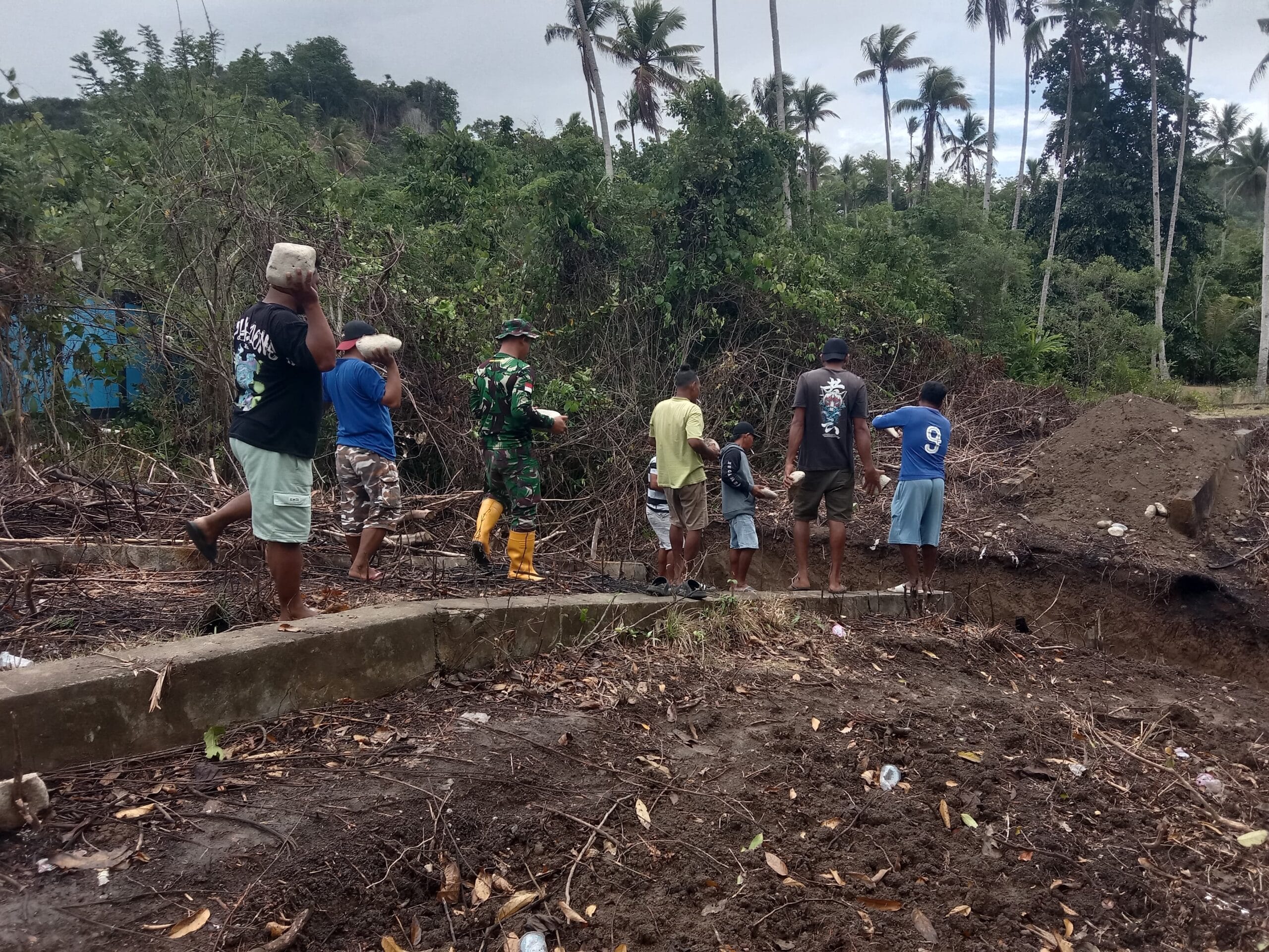 Dalam kegiatan tersebut, anggota Kodim 1505/Tidore bersama warga setempat terlihat kompak dan penuh semangat memindahkan material batu yang akan digunakan untuk pembangunan jembatan. Kebersamaan antara TNI dan rakyat tampak jelas saat bekerja bahu-membahu demi mempercepat proses pembangunan.